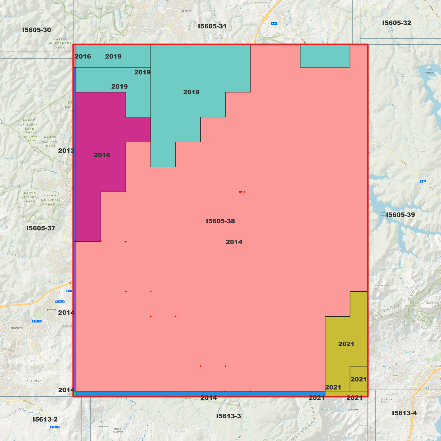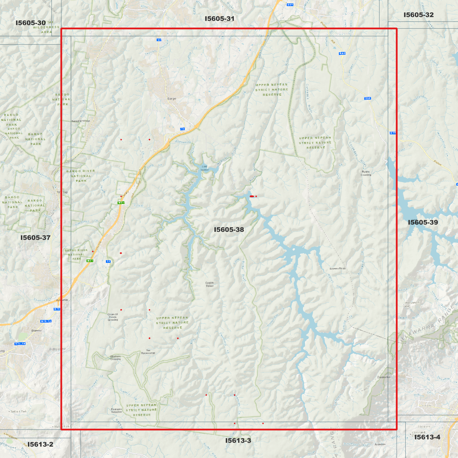Locations within the area; Cordeaux Dam, Nepean Dam, Avon Dam, Lake Nepean, Buxton, Yerrinbool, Balmoral, Bargo, Browns Road, Cupitts Forest, The Racecourse, Hambridge, Pearsons Selection, Lake Avon, Mount Lindsey, Colo, Dendrobium, Burke, Bargo, Wongawilli, Wilton, Banksia, Mittagong, Yerrinbool, Balmoral, Bargo, Avon, Huntley, Buxton, Yanderra, Mount Lindsey, Alpine