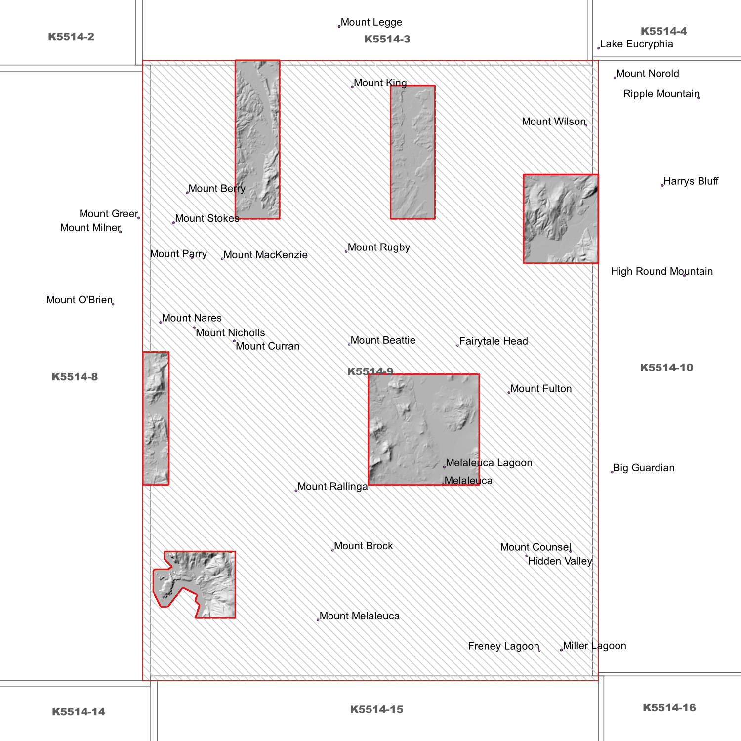 Locations within the area; Fairytale Head, Freney Lagoon, Hidden Valley, Melaleuca, Melaleuca Lagoon, Miller Lagoon, Mount Beattie, Mount Berry, Mount Brock, Mount Counsel, Mount Curran, Mount Fulton, Mount King, Mount MacKenzie, Mount Melaleuca, Mount Nares, Mount Nicholls, Mount Parry, Mount Rallinga, Mount Rugby, Mount Stokes, Mount Wilson