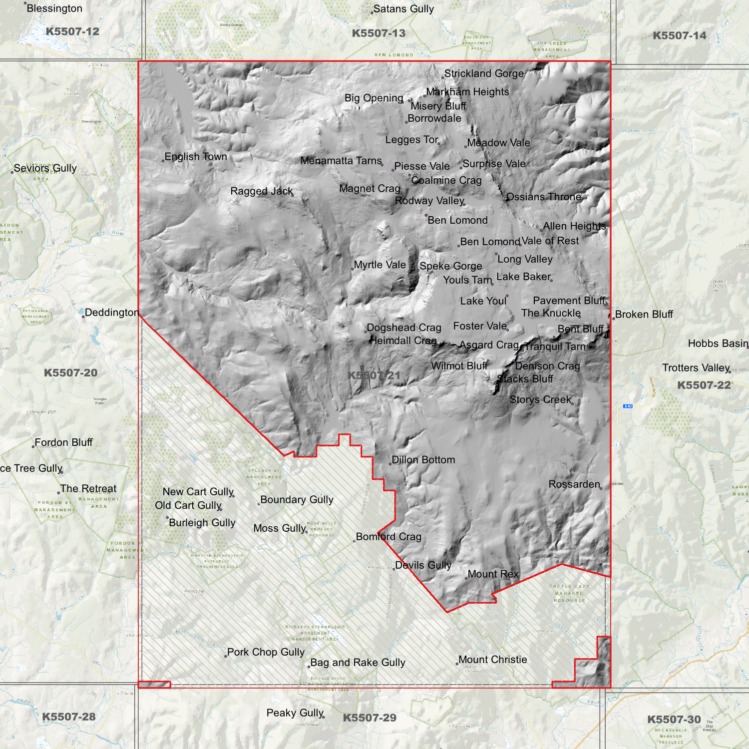 Locations within the area; Allen Heights, Asgard Crag, Bag and Rake Gully, Ben Lomond, Ben Lomond National Park, Bent Bluff, Big Opening, Bomford Crag, Borrowdale, Boundary Gully, Burleigh Gully, Coalmine Crag, Denison Crag, Devils Gully, Dillon Bottom, Dogshead Crag, English Town, Foster Vale, Heimdall Crag, Lake Baker, Lake Youl, Legges Tor, Long Valley, Magnet Crag, Markham Heights, Meadow Vale, Menamatta Tarns, Misery Bluff, Moss Gully, Mount Christie, Mount Rex, Myrtle Vale, New Cart Gully, Old Cart Gully, Ossians Throne, Pavement Bluff, Piesse Vale, Pork Chop Gully, Ragged Jack, Rodway Valley, Rossarden, Speke Gorge, Sphinx Bluff, Stacks Bluff, Storys Bluff, Storys Creek, Strickland Gorge, Surprise Vale, The Knuckle, Tranquil Tarn, Vale of Rest, Wilmot Bluff, Youls Tarn
