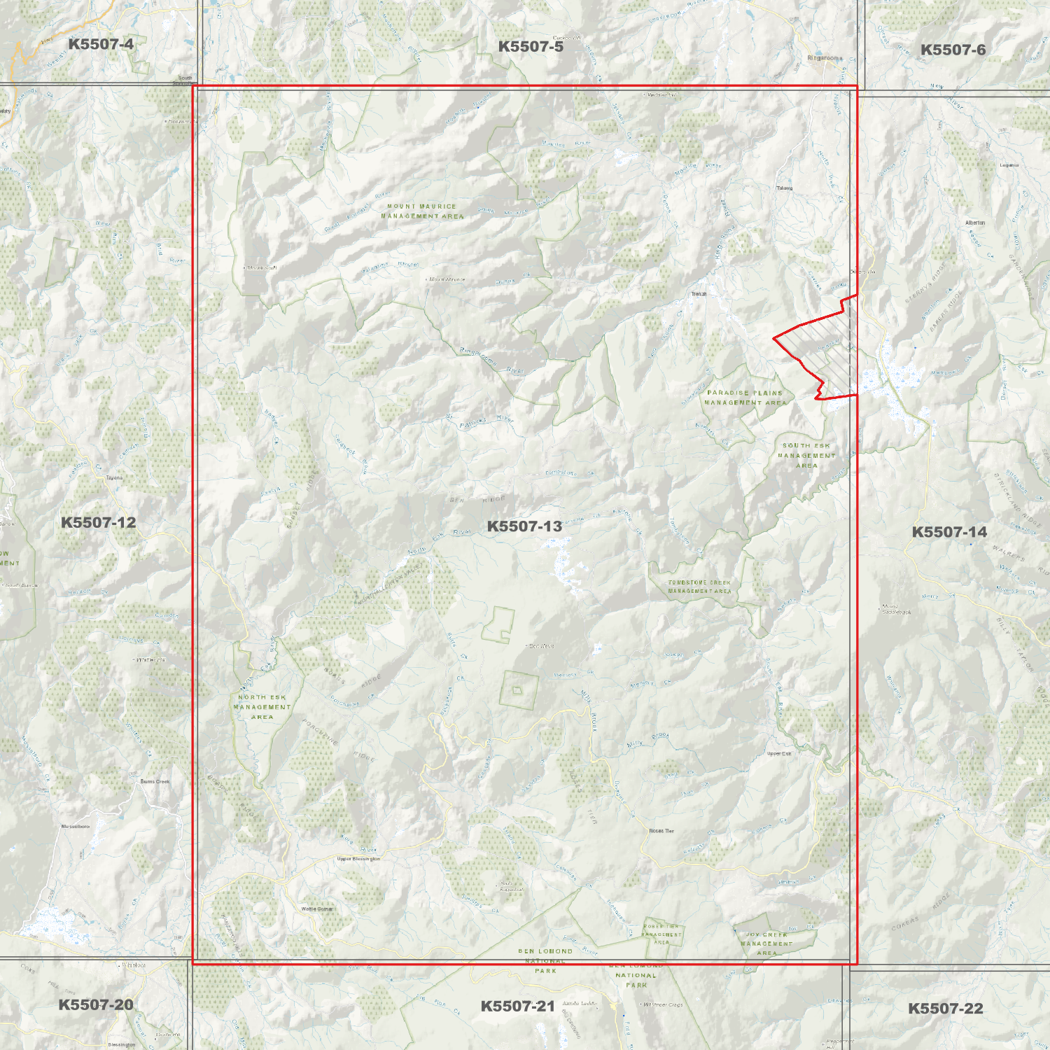 Locations within the area; Ben Nevis, Dunns Creek Dam, Dunns Lake, Lohreys Gully, Mount Heathorn, Mount Helen, Mount Maurice, Mount Scott, Northallerton Valley, Roses Tier, Satans Gully, South Springfield, Talawa, Tayene, Trenah, Upper Blessington, Upper Esk