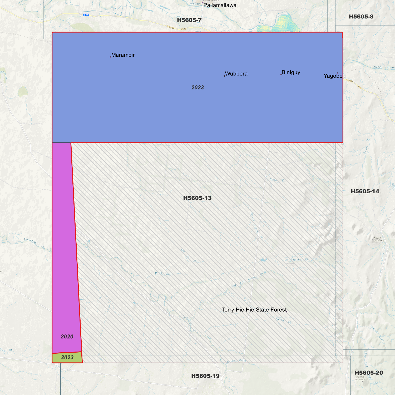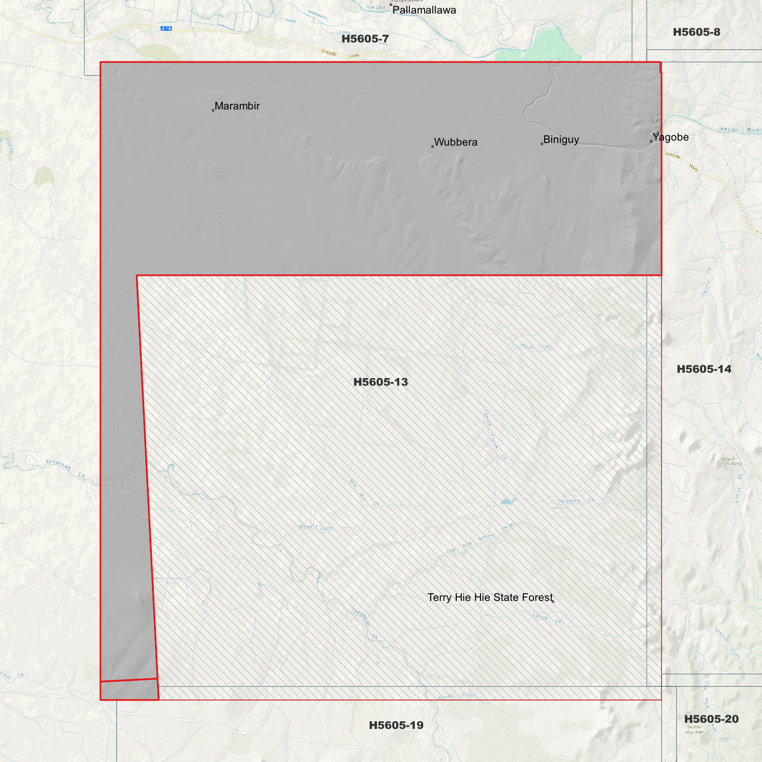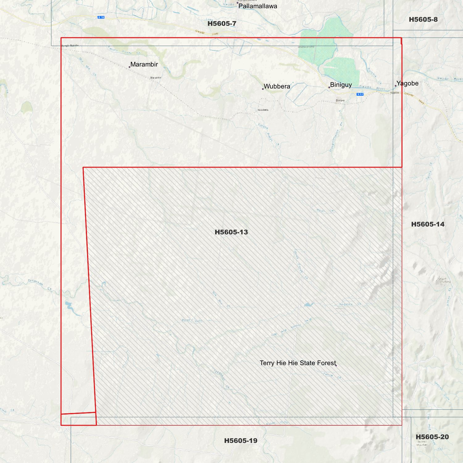 Locations within the area; Biniguy, Marambir, Terry Hie Hie State Forest, Wubbera
