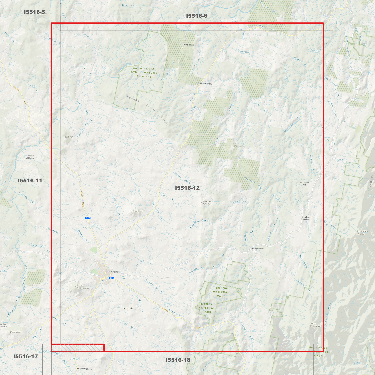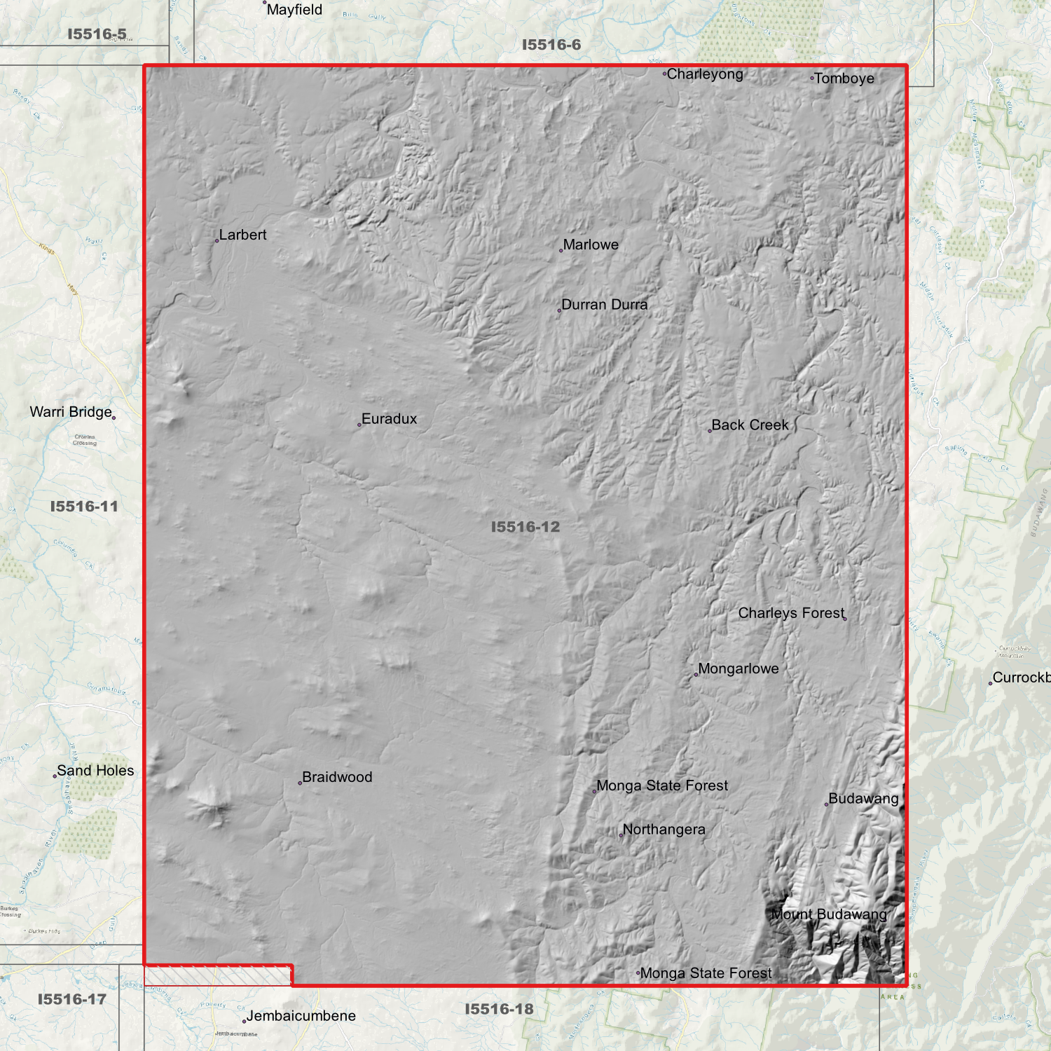 Braidwood 1mDEM (I5516-12) compiled with data supplied by NSW Government (Spatial Services).