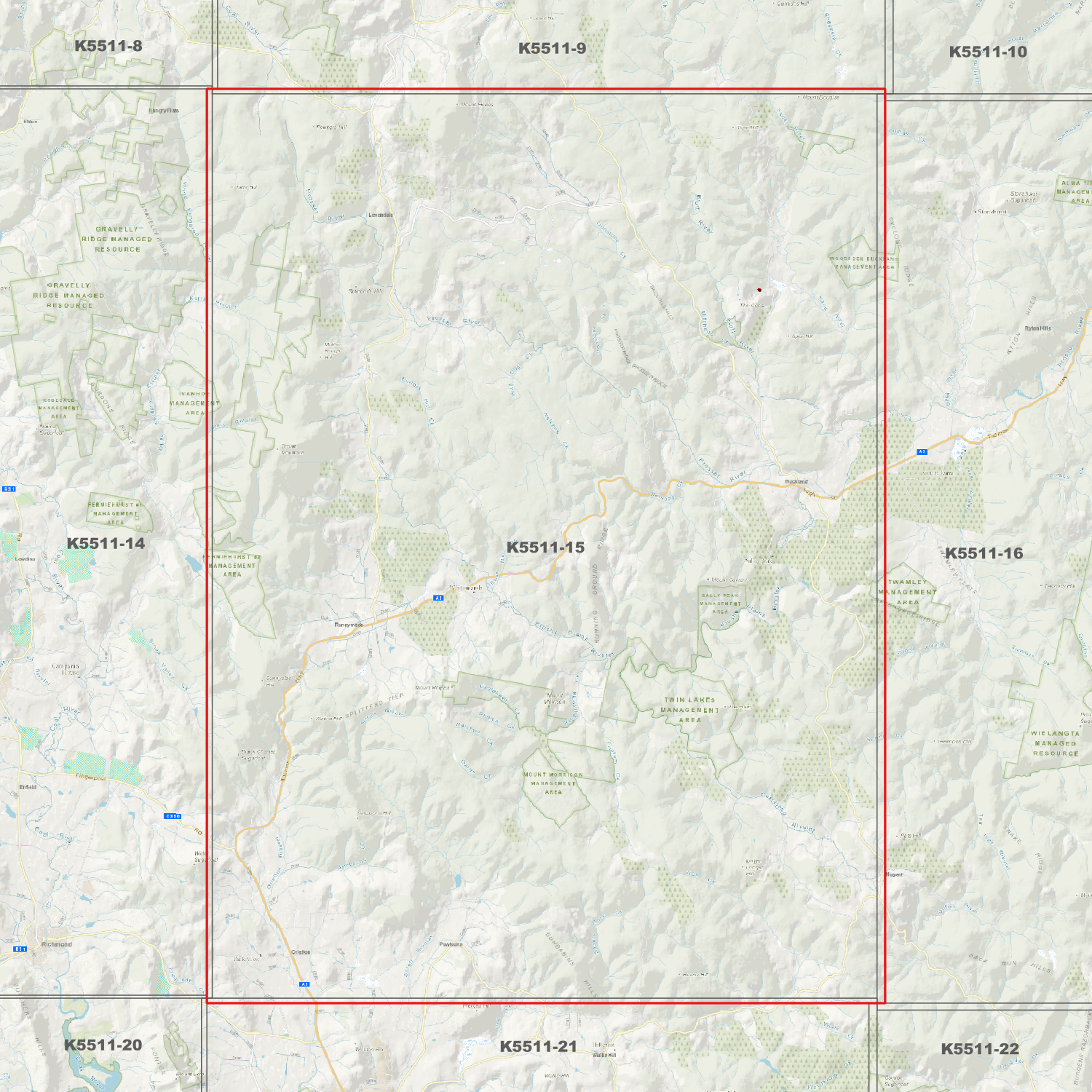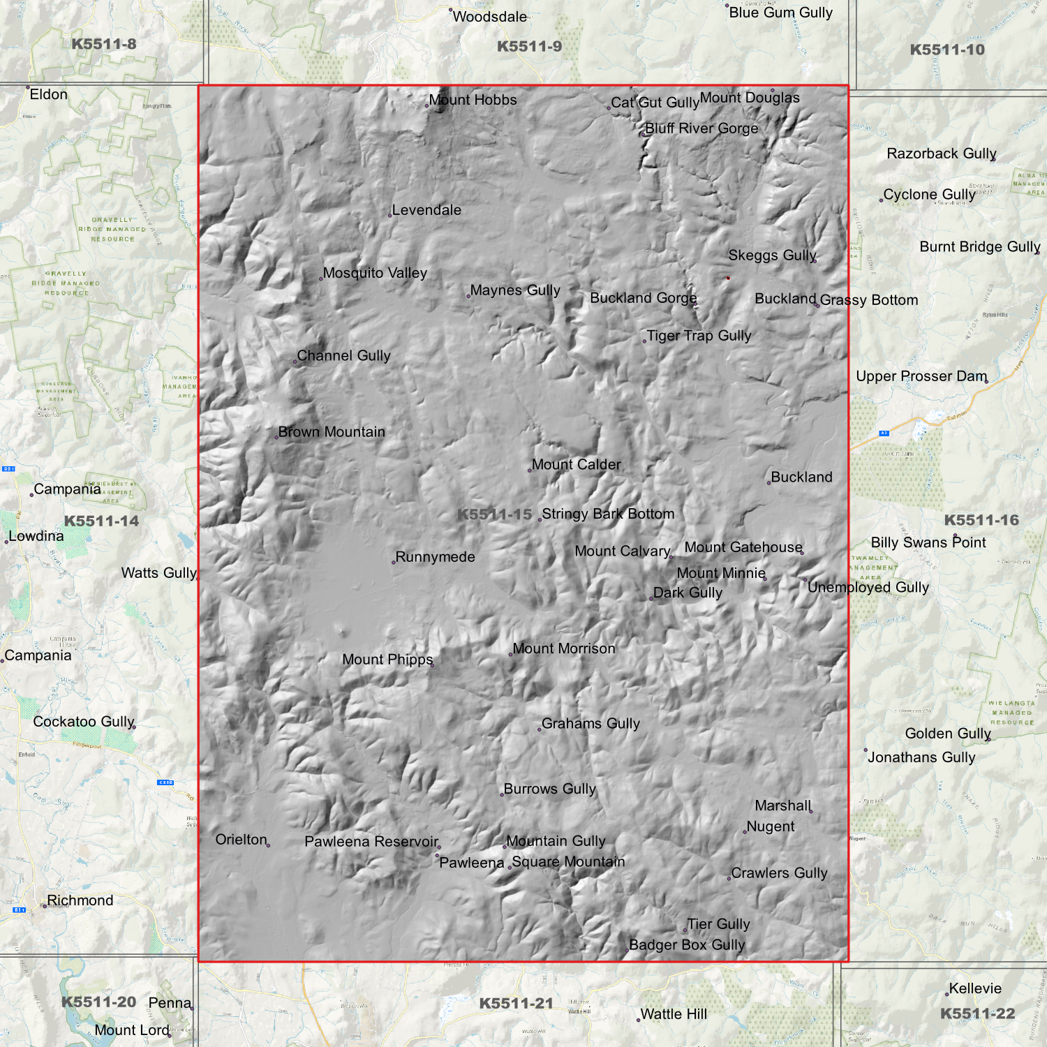 Locations within the area; Badger Box Gully, Bluff River Gorge, Brown Mountain, Buckland, Buckland Gorge, Burrows Gully, Cat Gut Gully, Channel Gully, Crawlers Gully, Dark Gully, Grahams Gully, Grassy Bottom, Levendale, Marshall, Maynes Gully, Mosquito Valley, Mount Calder, Mount Calvary, Mount Douglas, Mount Gatehouse, Mount Hobbs, Mount Minnie, Mount Morrison, Mount Phipps, Mountain Gully, Nugent, Orielton, Pawleena, Pawleena Reservoir, Runnymede, Skeggs Gully, Square Mountain, Stringy Bark Bottom, Tier Gully, Tiger Trap Gully, Unemployed Gully