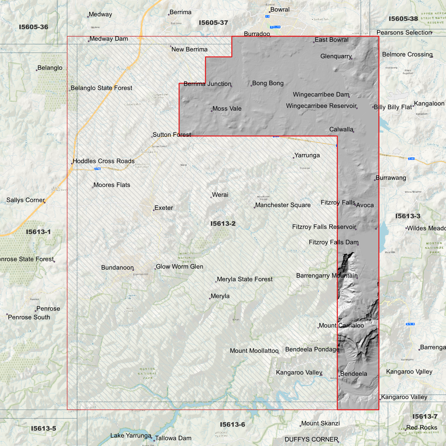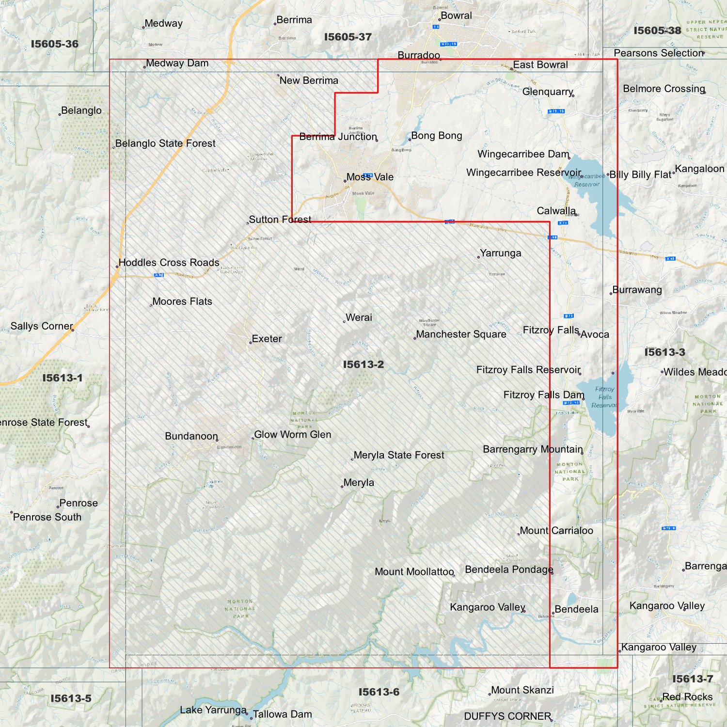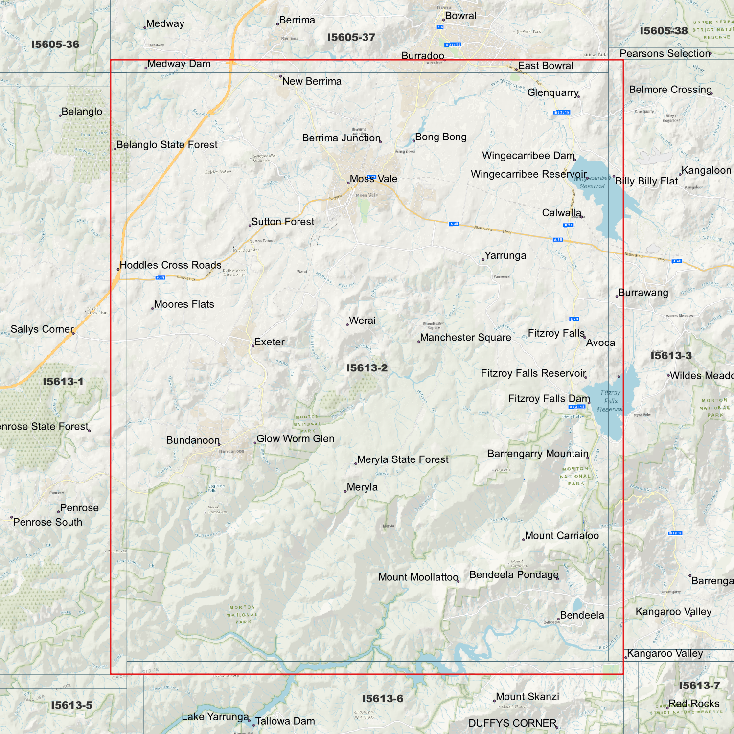 Locations within the area; Avoca, Barrengarry Mountain, Belanglo, Bendeela, Berrima Junction, Bong Bong, Bundanoon, Burrawang, Calwalla, Exeter, Fitzroy Falls, Glenquarry, Glow Worm Glen, Hoddles Cross Roads, Kangaroo Valley, Manchester Square, Meryla, Moores Flats, Moss Vale, Mount Carrialoo, Mount Moollattoo, Sutton Forest, Werai, Wingecarribee Reservoir, Yarrunga