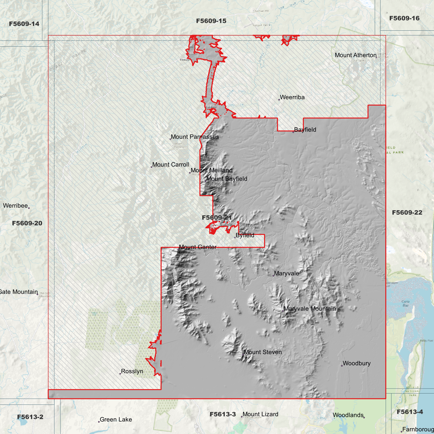 Locations within the area; Byfield, Maryvale Mountain, Mount Atherton, Mount Bayfield, Mount Carroll, Mount Ganter, Mount Meilland, Mount Parnassus, Mount Steven, Weerriba, Woodbury