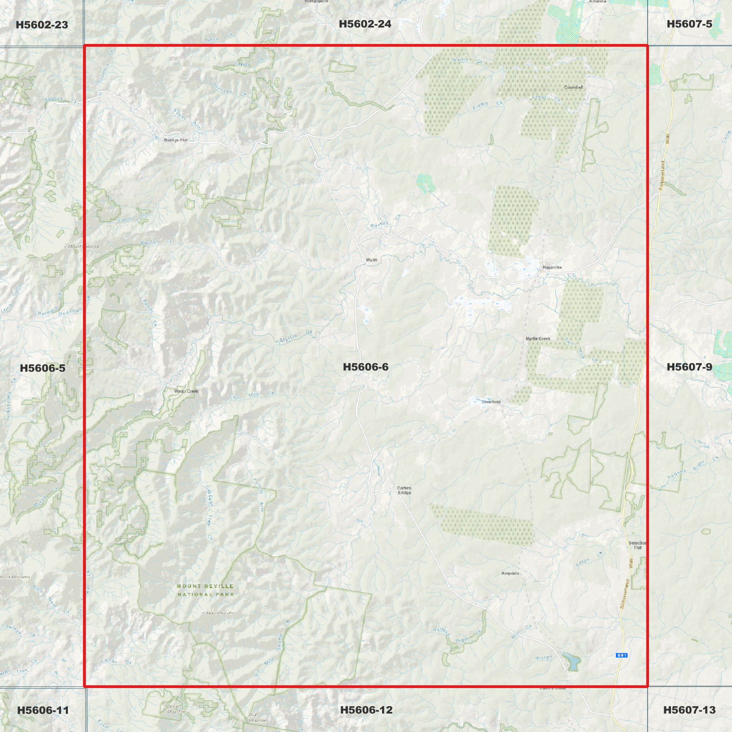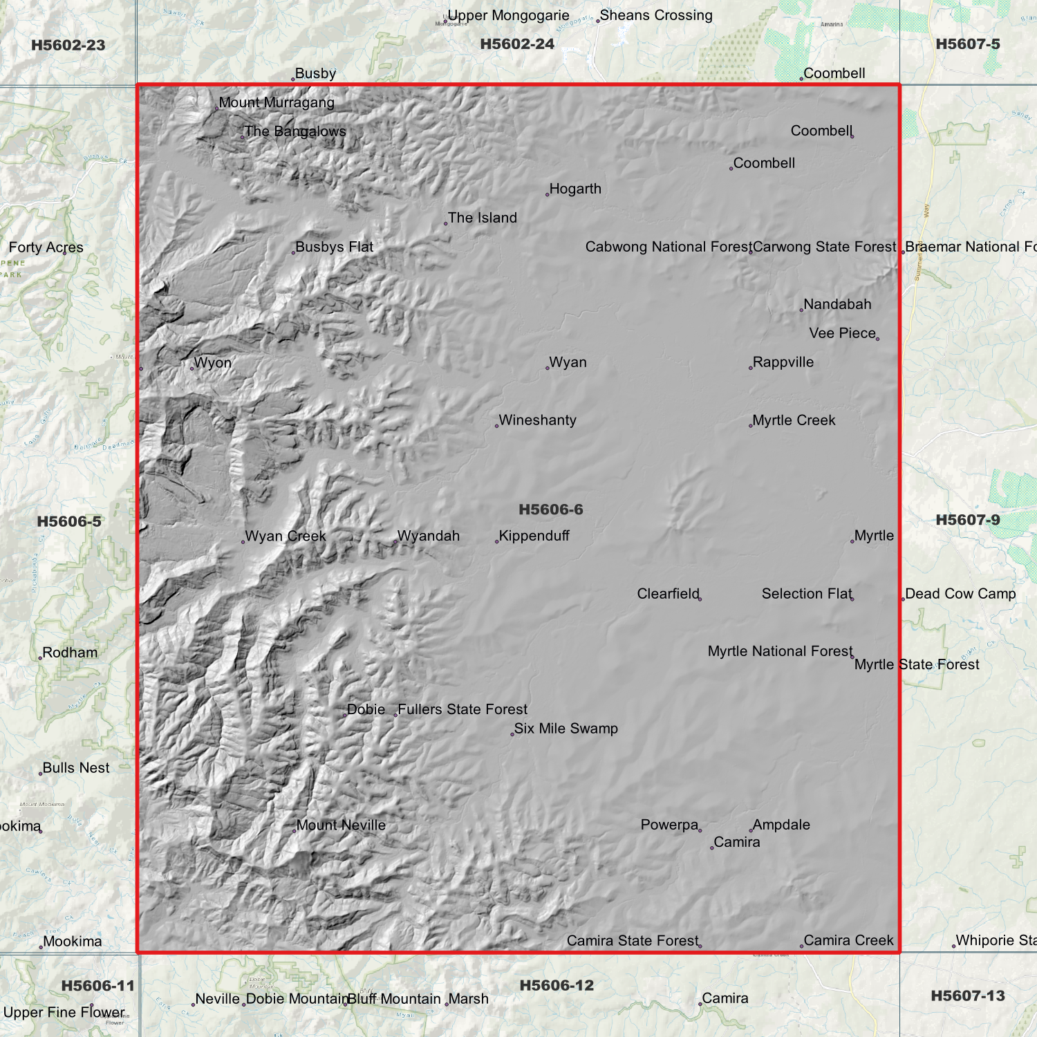 Locations within the area; Coombell, Camira Creek, Rappville, Ampdale, The Island, The Bangalows, Vee Piece, Wyan Creek, Wineshanty, Selection Flat, Mount Neville, Mount Belmore, Mount Murragang, Dobie, Hogarth, Wyandah, Wyon, Nandabah, Myrtle, Powerpa, Clearfield, Busbys Flat, Six Mile Swamp, Camira, Wyan, Kippenduff, Myrtle Creek