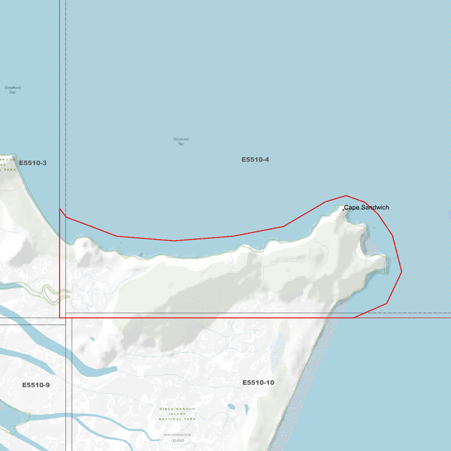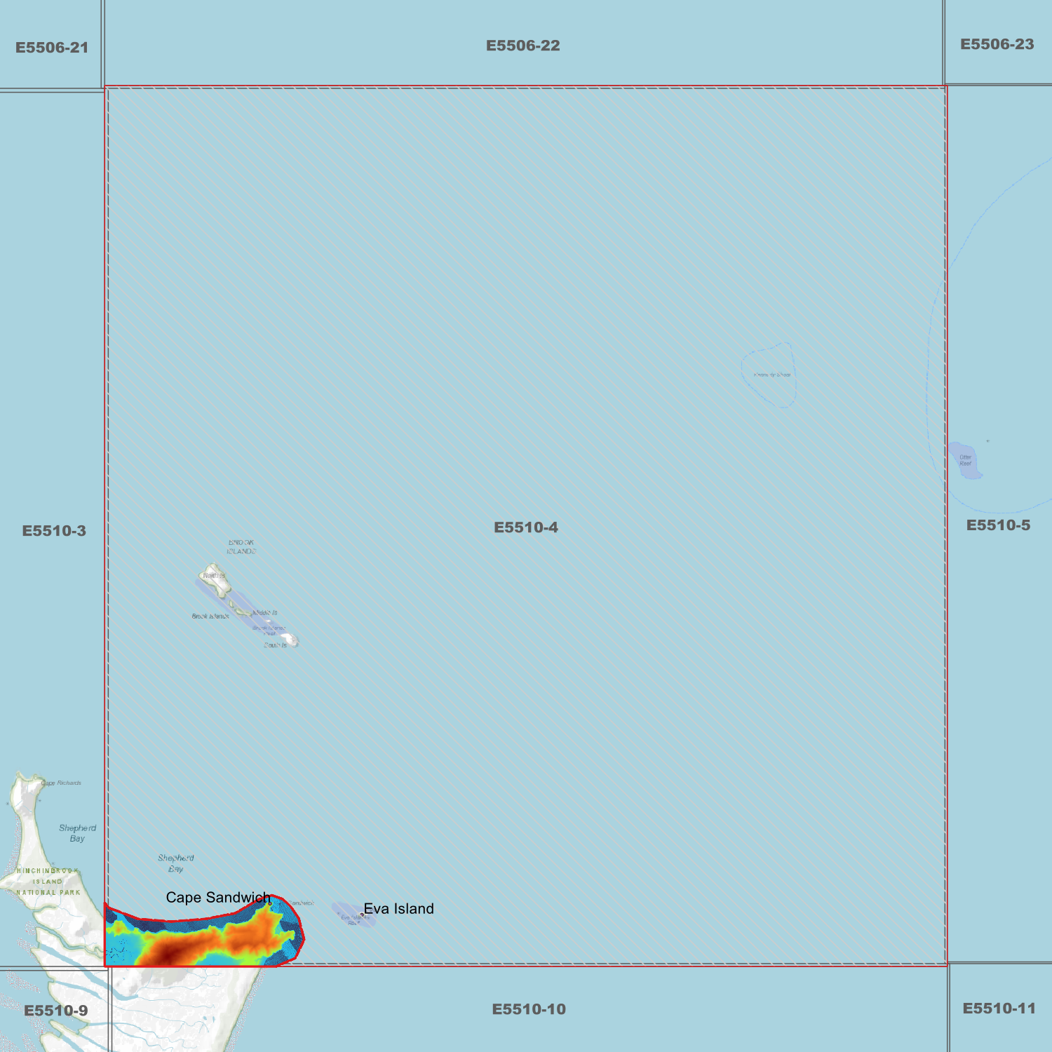 Locations within the area; Cape Sandwich, Eva Island, Hinchinbrook Island