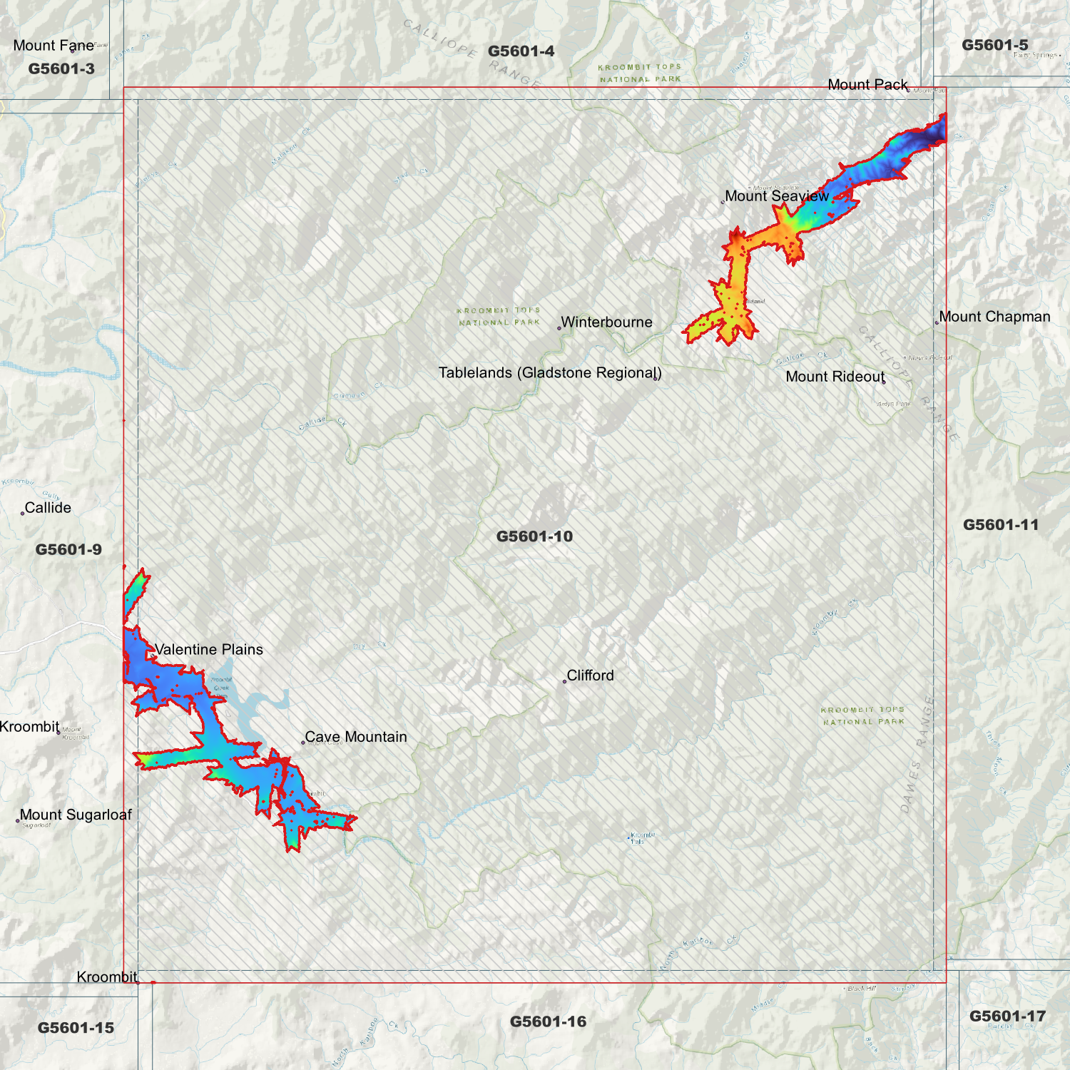 Locations within the area; Cave Mountain, Mount Chapman, Mount Pack, Mount Rideout, Mount Seaview, Tablelands (Gladstone Regional), Valentine Plains