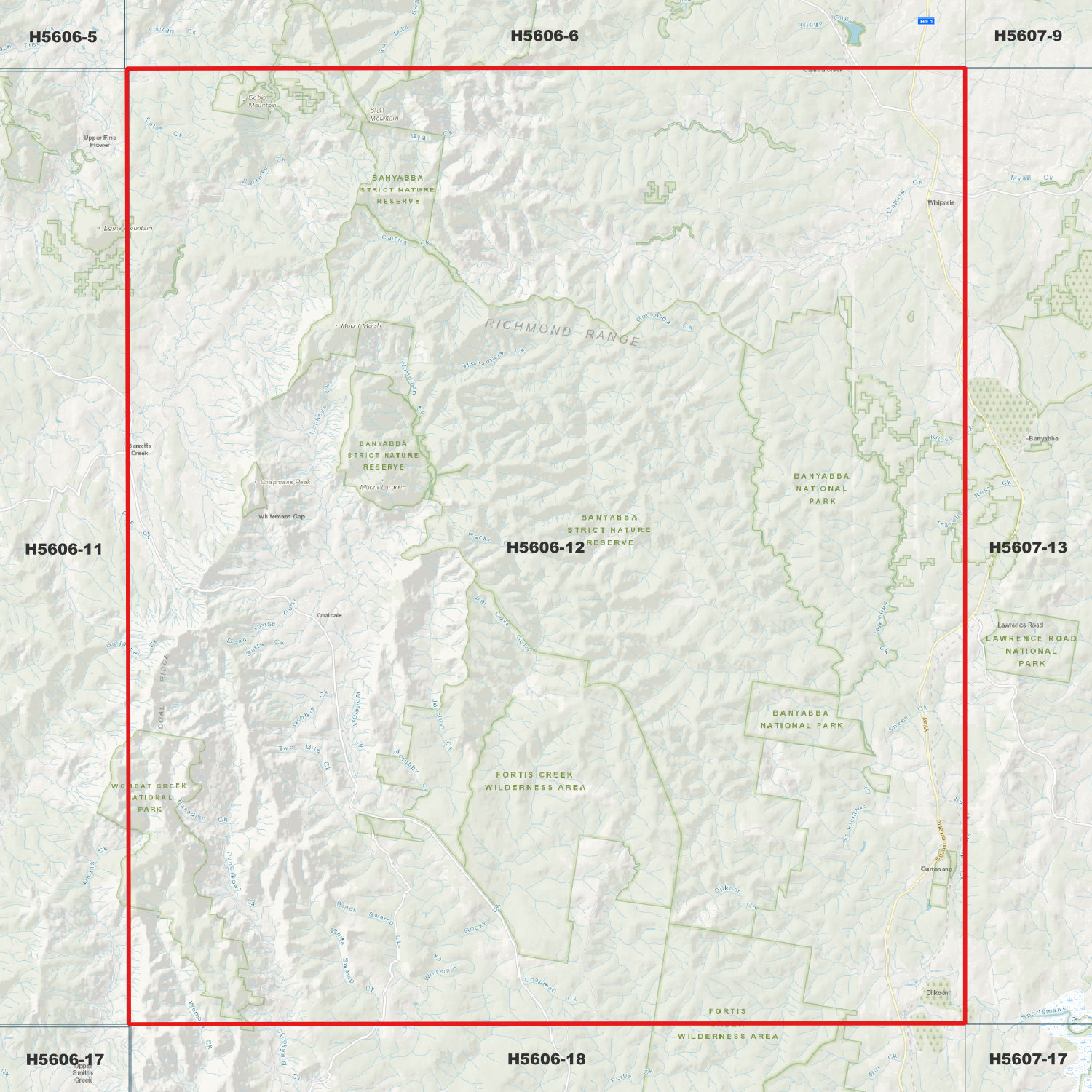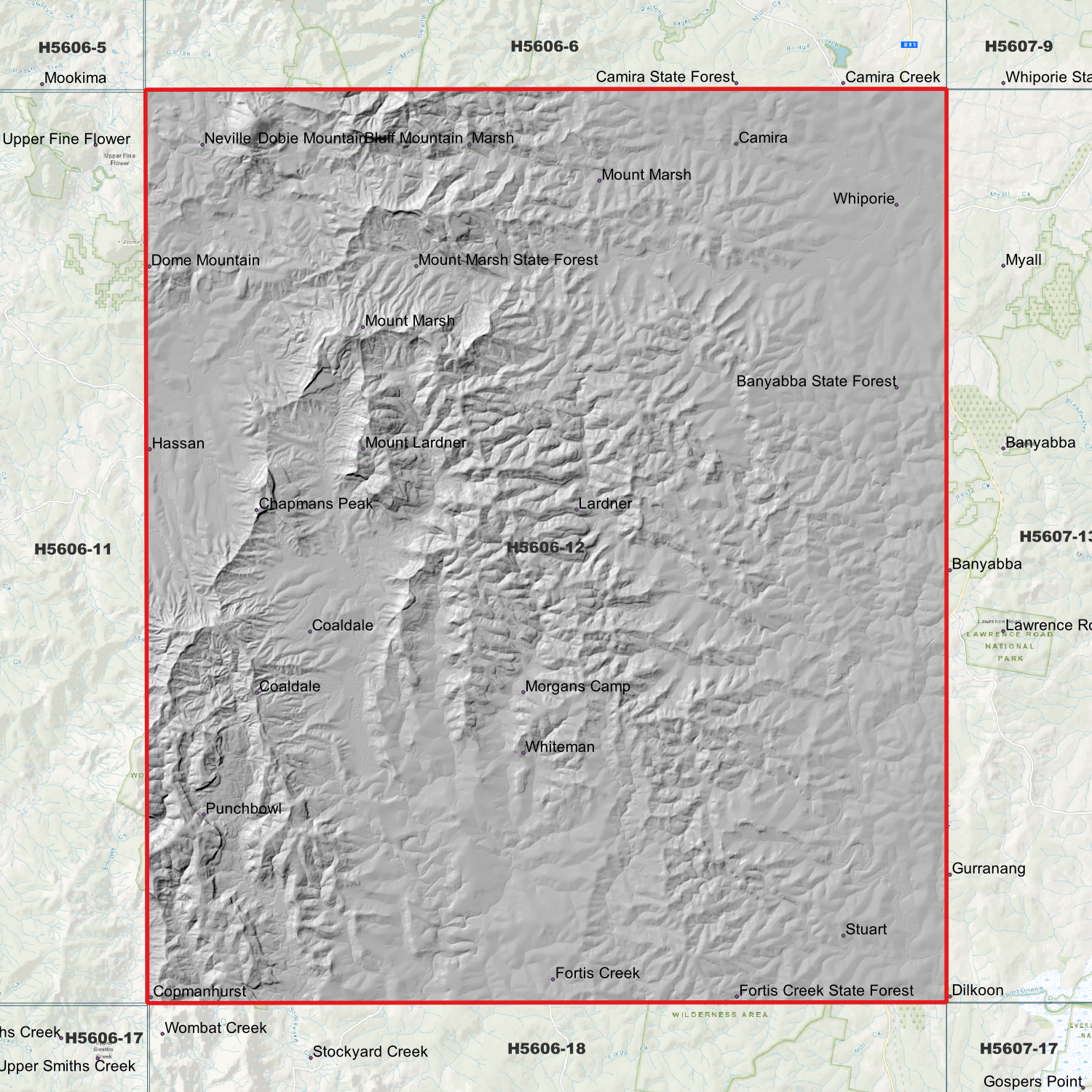 Locations within the area; Morgans Camp, Chapmans Peak, Dome Mountain, Bluff Mountain, Dobie Mountain, Mount Lardner, Mount Marsh, Coaldale, Copmanhurst, Lardner, Marsh, Neville, Stuart, Whiteman, Hassan, Fortis Creek, Whiporie, Barretts Creek, Punchbowl