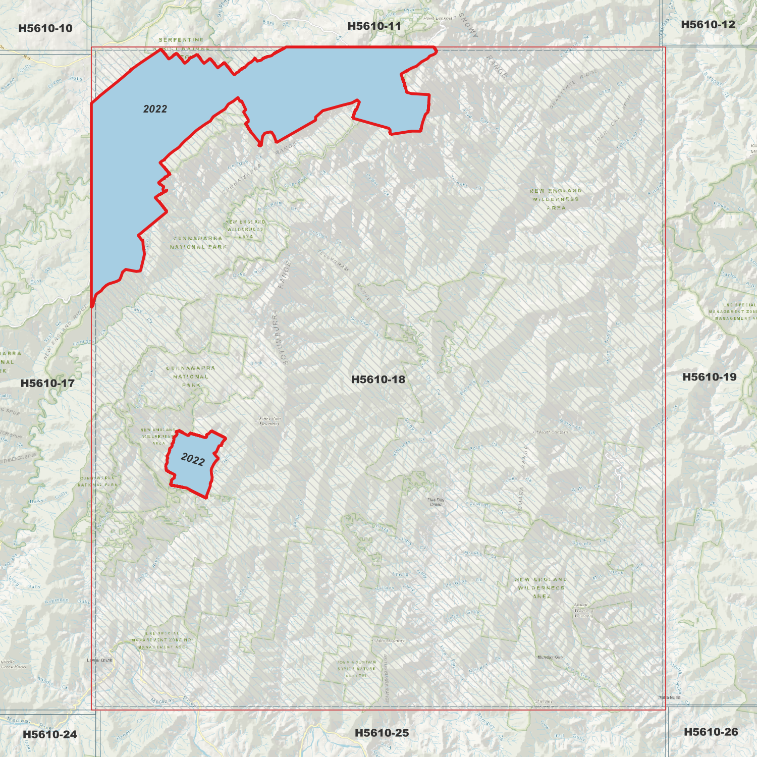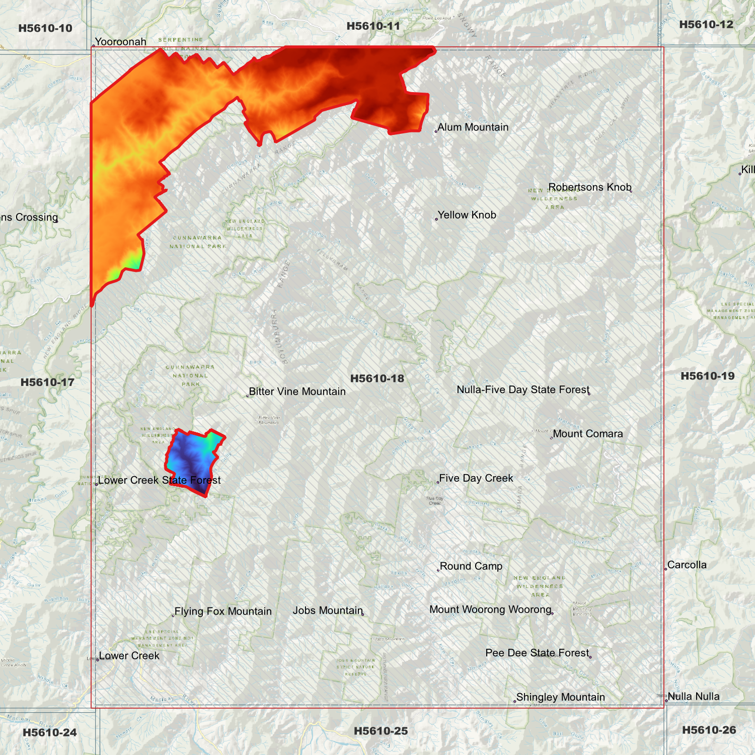 Locations within the area; Five Day Creek, Round Camp, Mount Comara, Robertsons Knob, Alum Mountain, Mount Woorong Woorong, Yellow Knob, Flying Fox Mountain, Pine Knob, Bitter Vine Mountain, Hawes Knob, Jobs Mountain, Shingley Mountain, Cliffs, Cochrane, Comara, Cunnawarra, Wolseley, Dyke, Nulla Nulla, Stuart, Mowle, Pee Dee, Lower Creek