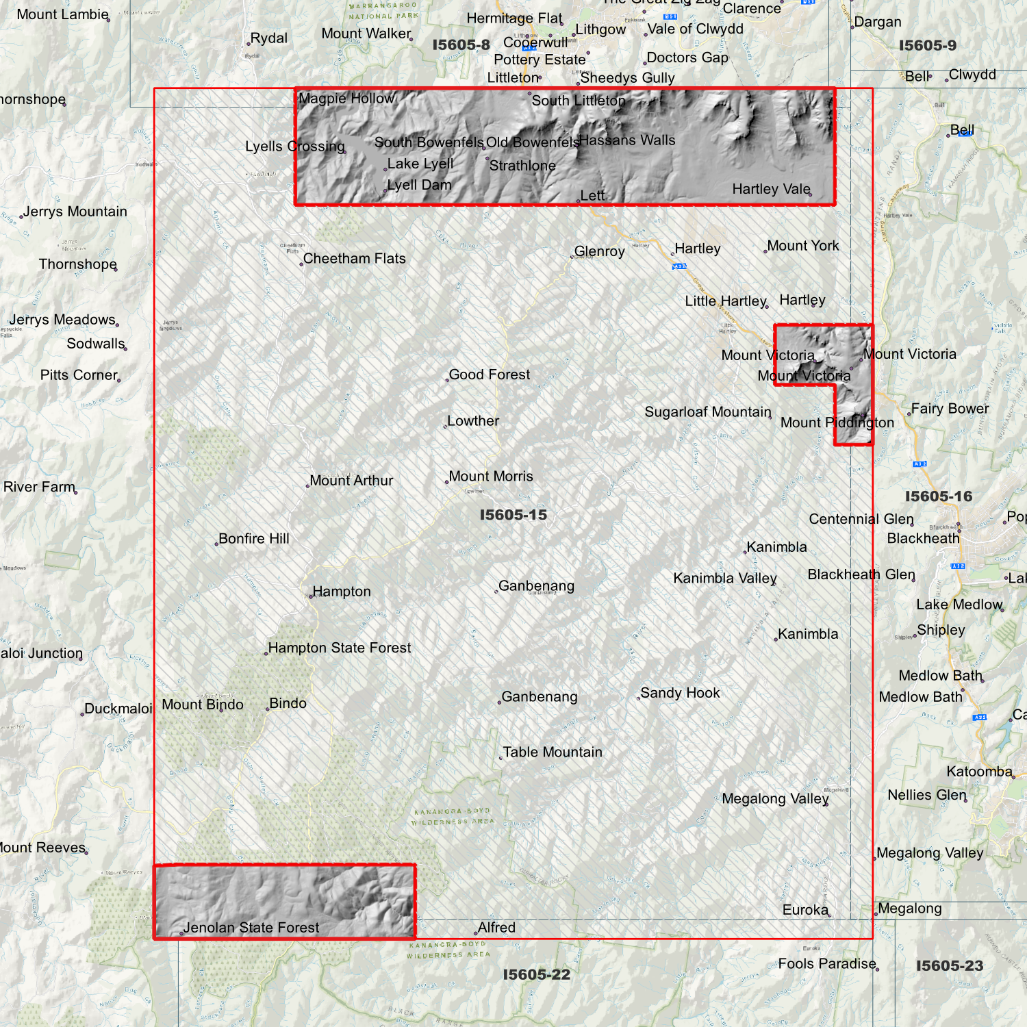 Locations within the area; Lyell Dam, Lake Lyell, Kanimbla Valley, Jenolan State Forest, Hampton State Forest, Cheetham Flats, Euroka, Glenroy, Lyells Crossing, Sandy Hook, Strathlone, Old Bowenfels, Mount Bindo, Mount Arthur, Mount York, Table Mountain, Sugarloaf Mountain, Bonfire Hill, Mount Victoria, Mount Morris, Bindo, Ganbenang, Lett, Lowther, Hartley, Kanimbla, Kanimbla, Hassans Walls, Mount Victoria, Good Forest, Ganbenang, Little Hartley, Lowther, Megalong Valley, Hampton, Hartley, Hartley Vale, South Bowenfels