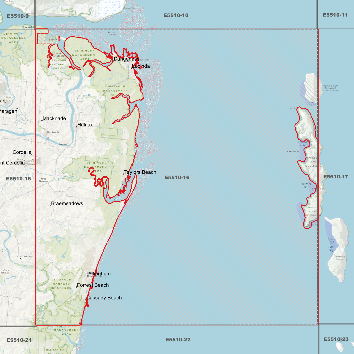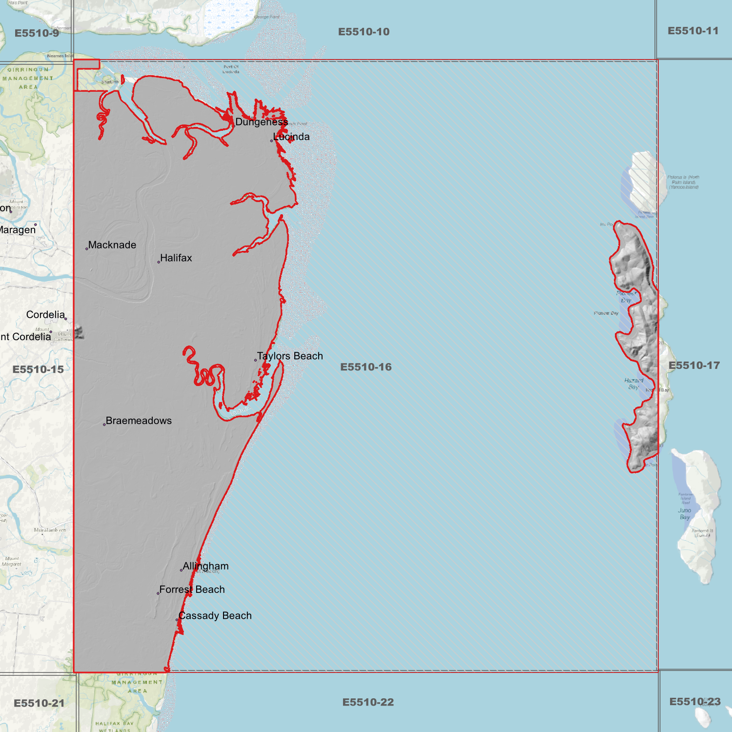 Locations within the area; Allingham, Braemeadows, Cassady Beach, Dungeness, Forrest Beach, Halifax, Lucinda, Macknade, Taylors Beach