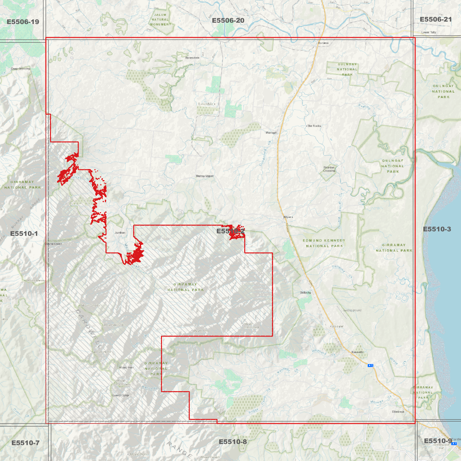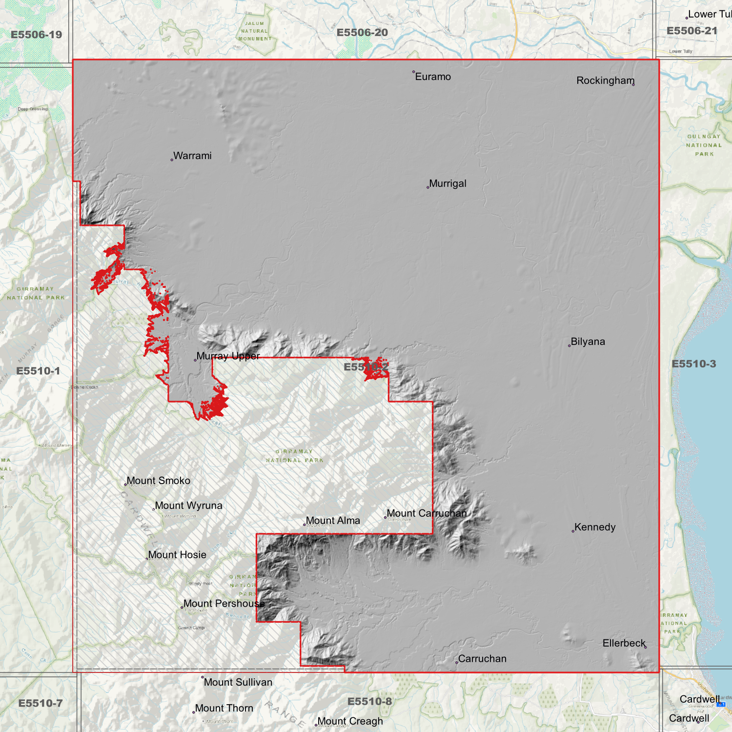 Locations within the area; Bilyana, Carruchan, Ellerbeck, Euramo, Kennedy, Mount Alma, Mount Carruchan, Mount Hosie, Mount Pershouse, Mount Smoko, Mount Wyruna, Murray Upper, Murrigal, Rockingham, Warrami.