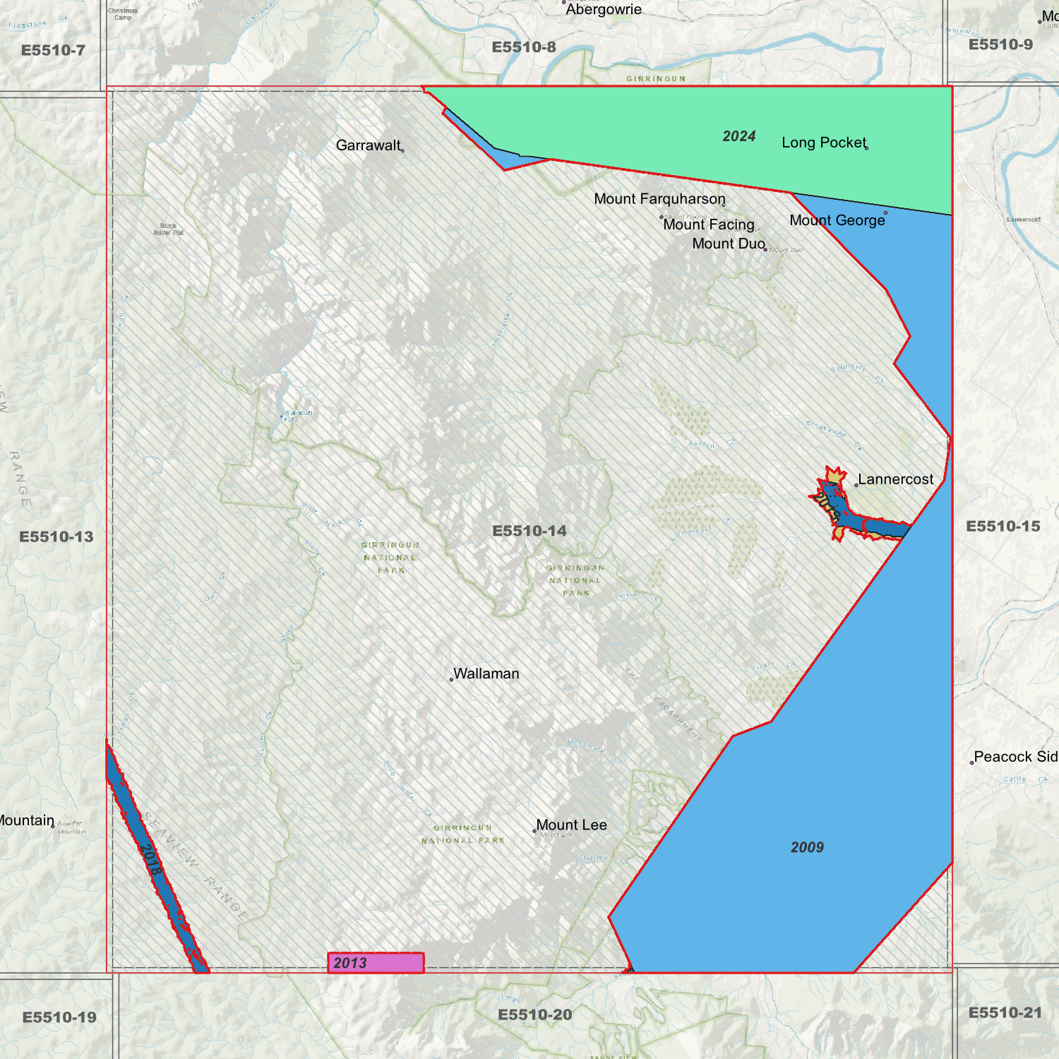 Locations within the area; Garrawalt, Lannercost, Long Pocket, Mount Duo, Mount Facing, Mount Farquharson, Mount George, Mount Lee, Wallaman